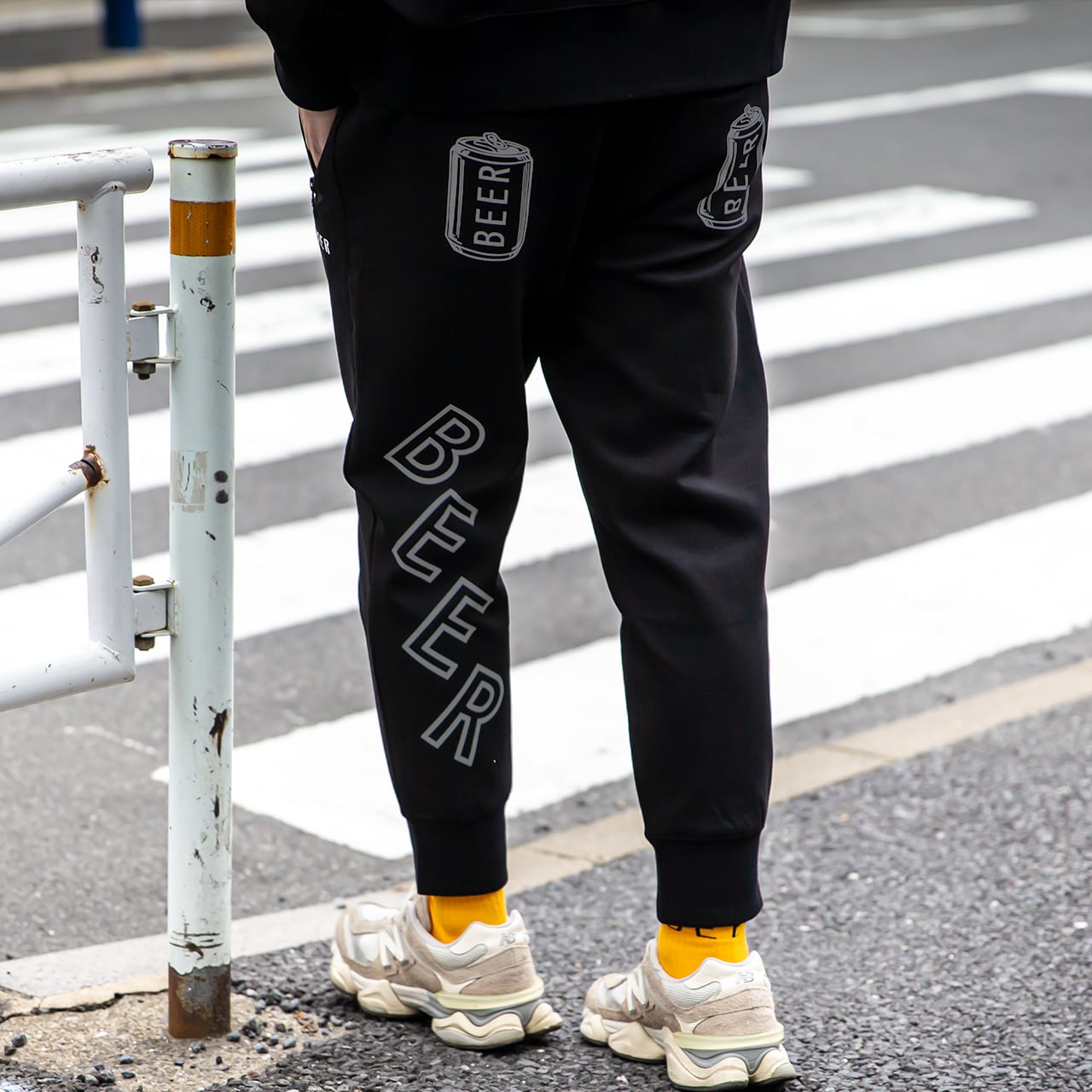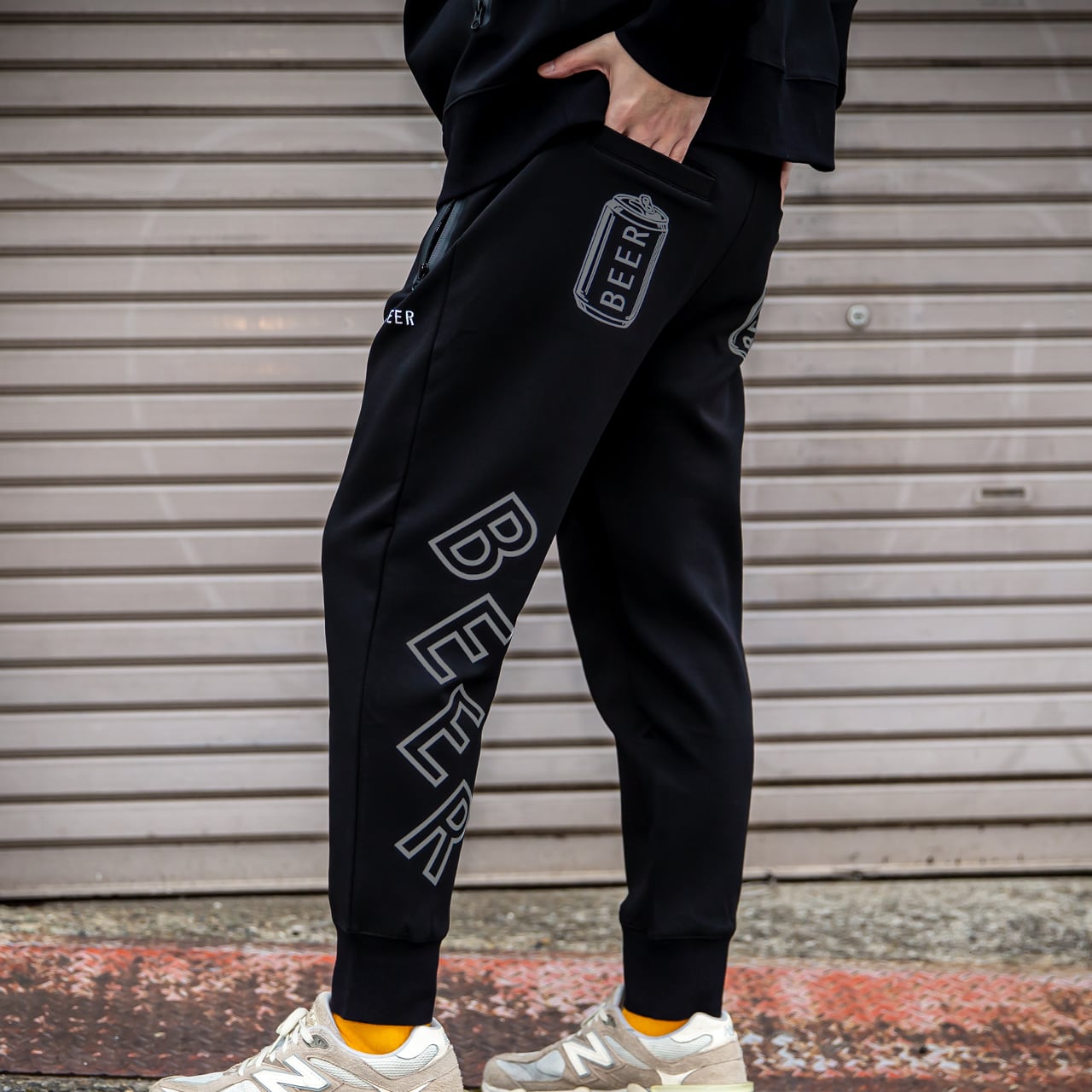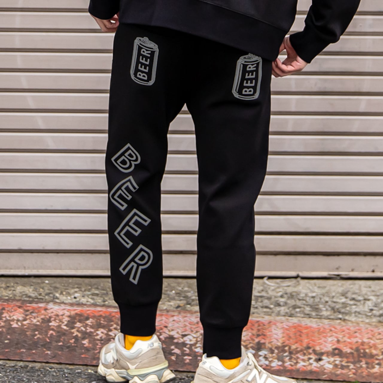 背面:両ポケットに缶ロゴプリント、左足裏側にBEERのプリント。