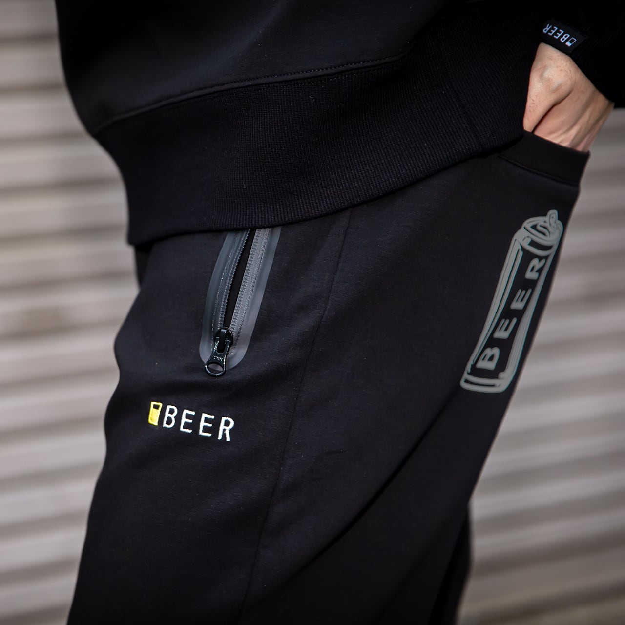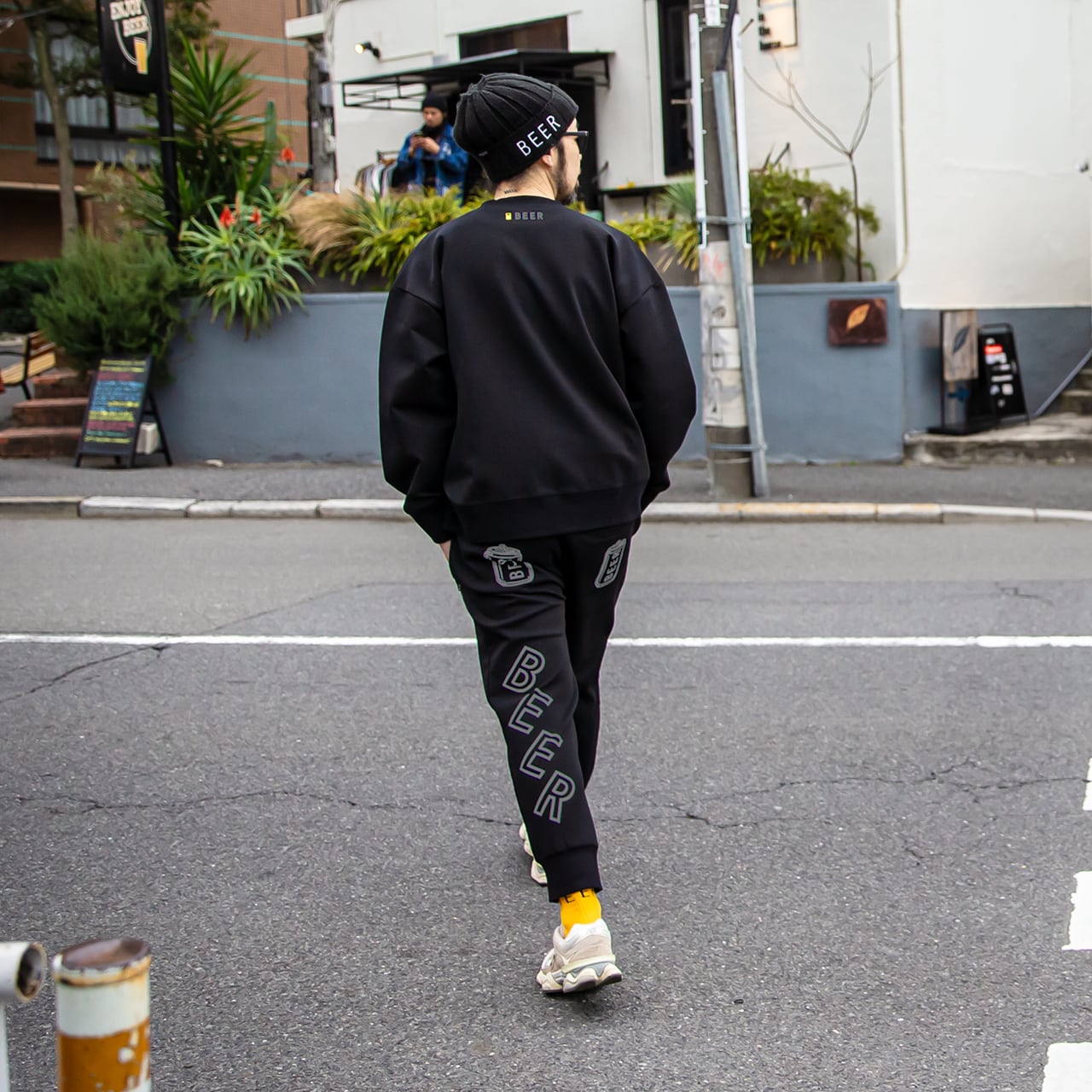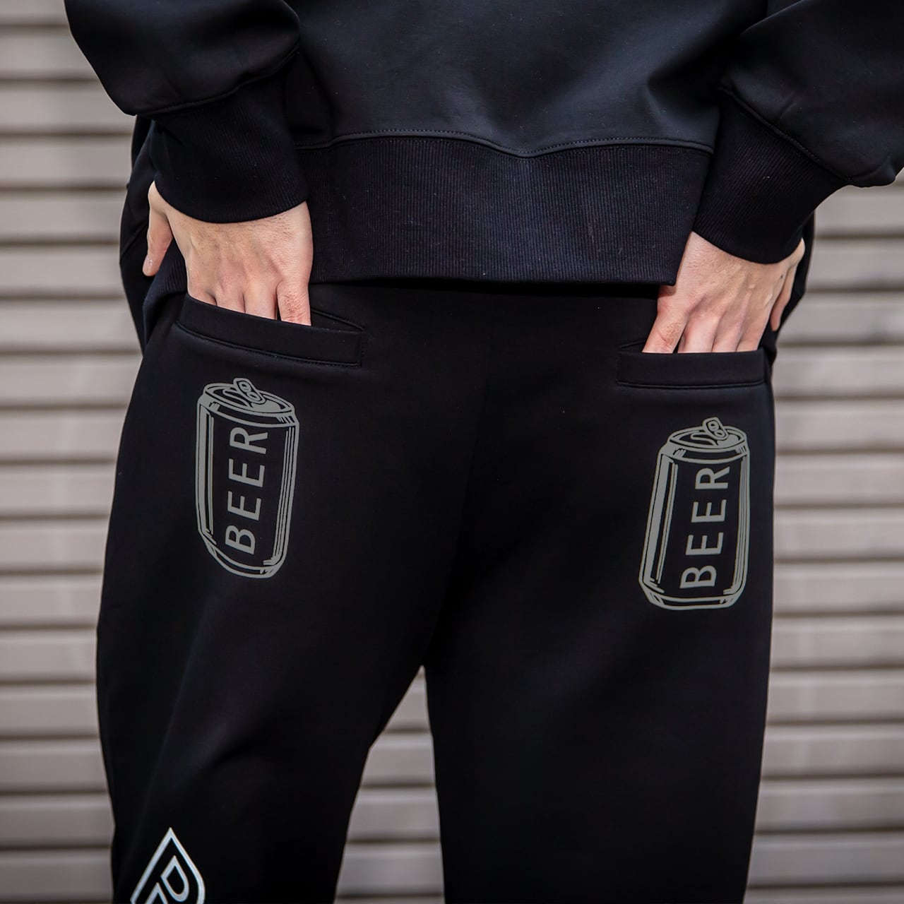 背面:両ポケットに缶ロゴプリント、左足裏側にBEERのプリント。
