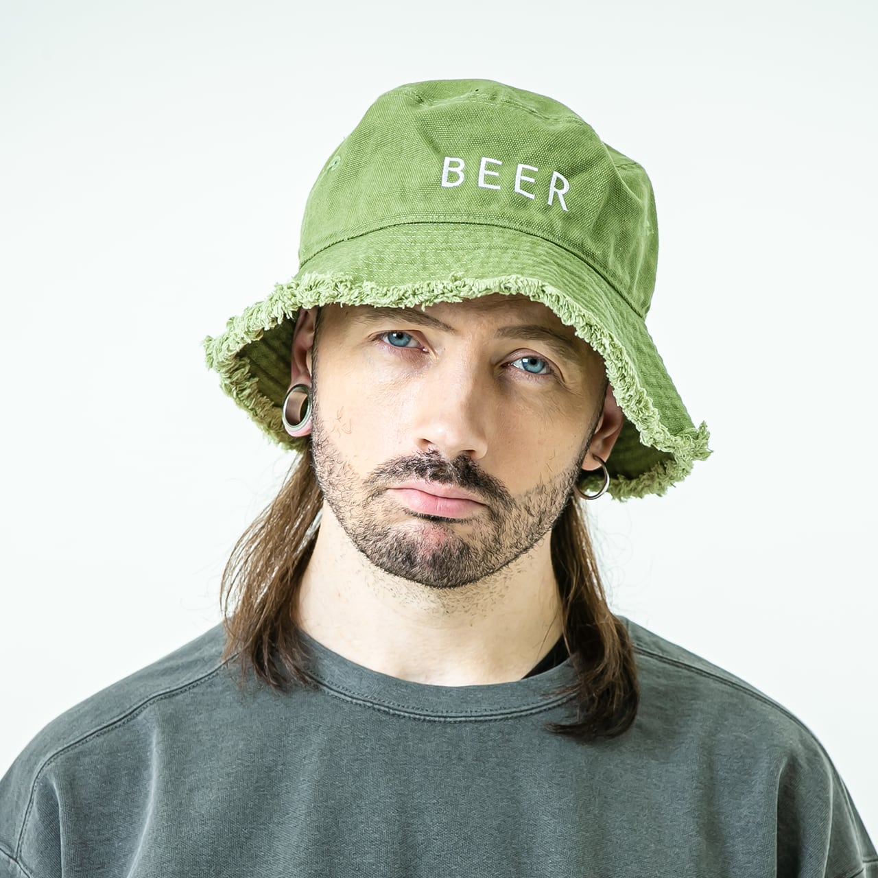 フリンジ加工のあるバケットハットにBEERロゴを刺繍。