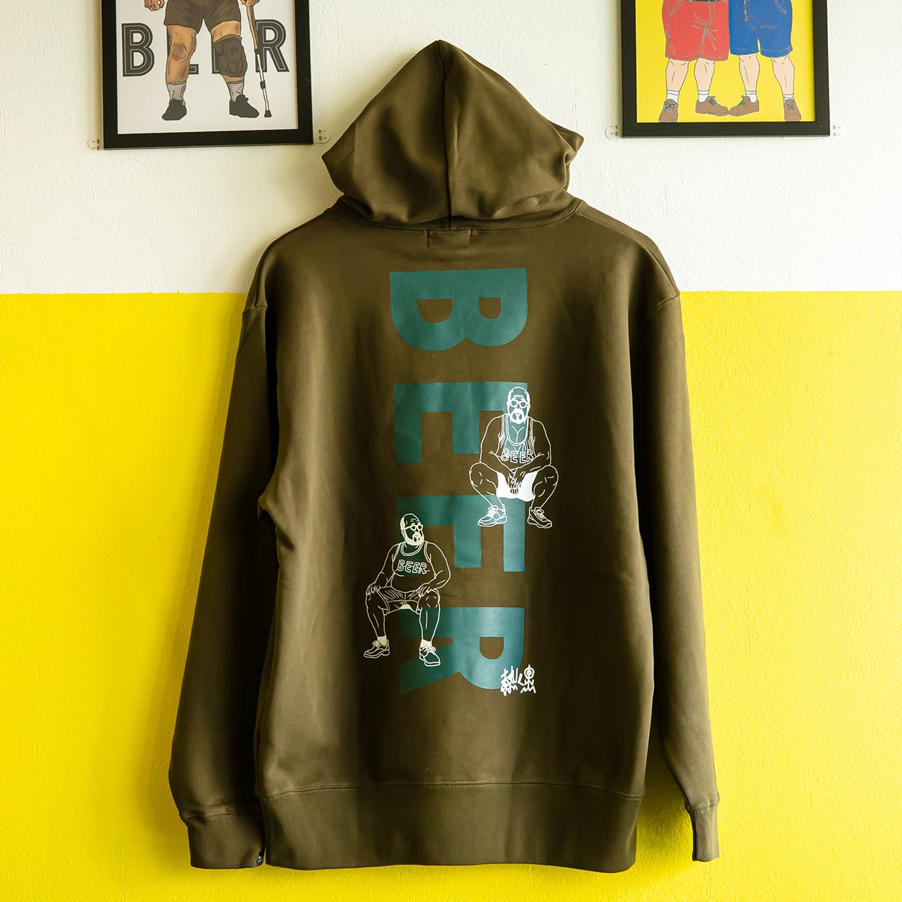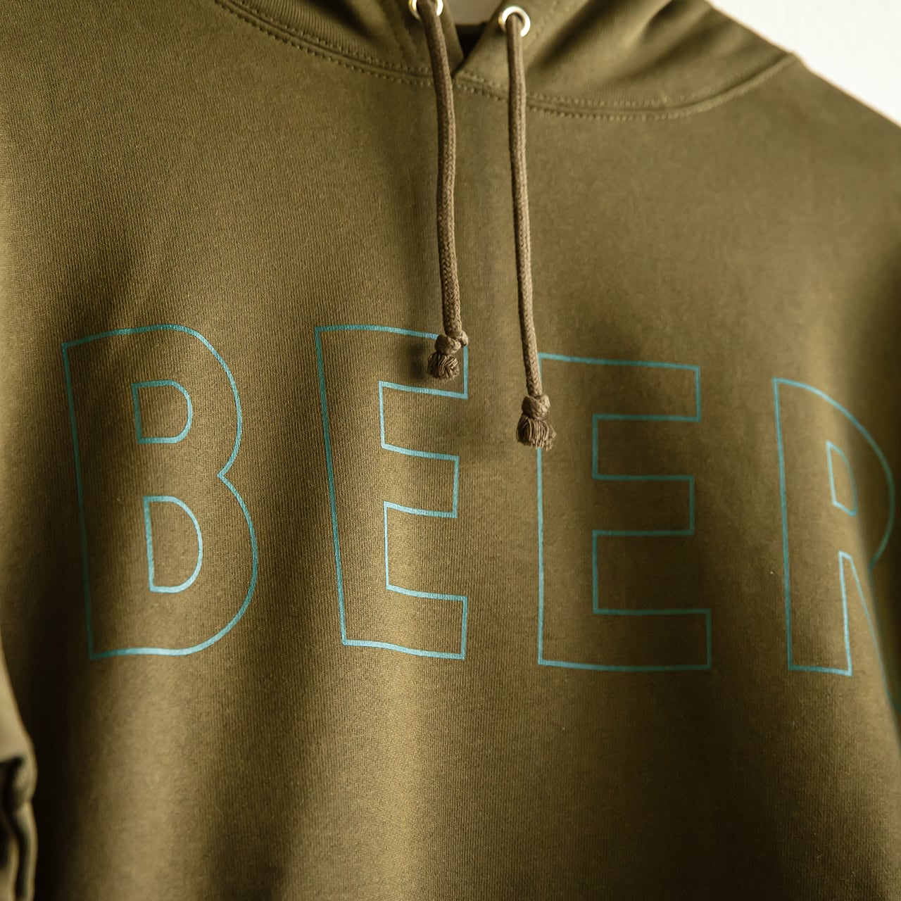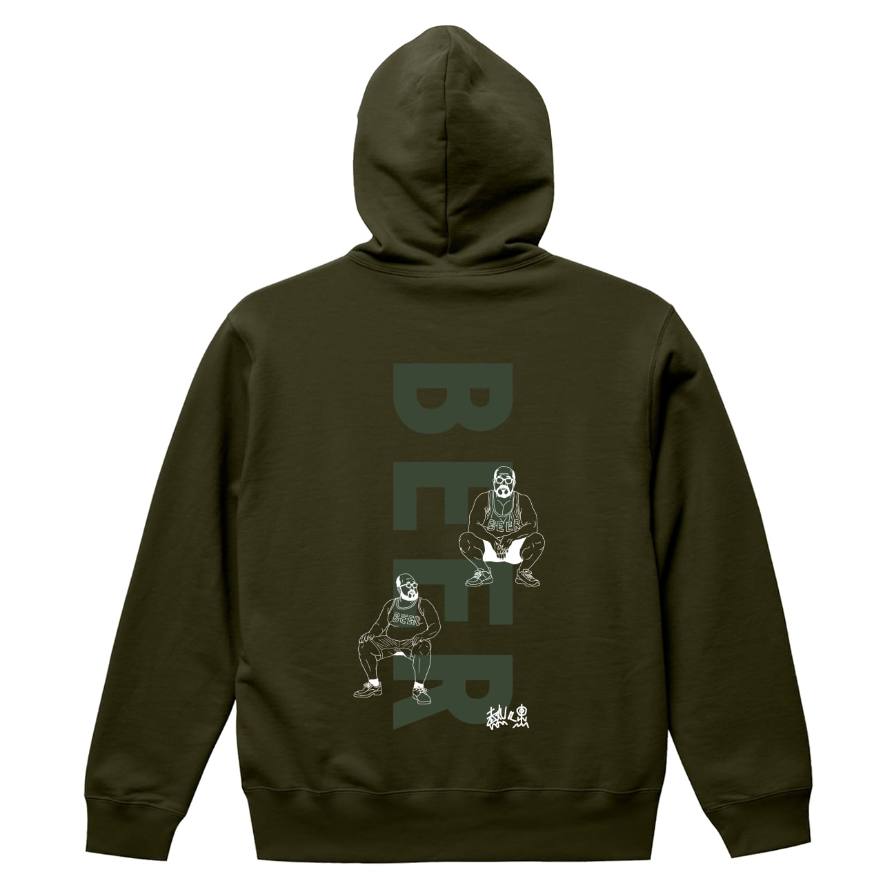 後面:縦の大きなBEERロゴにイラストを重ねてプリント