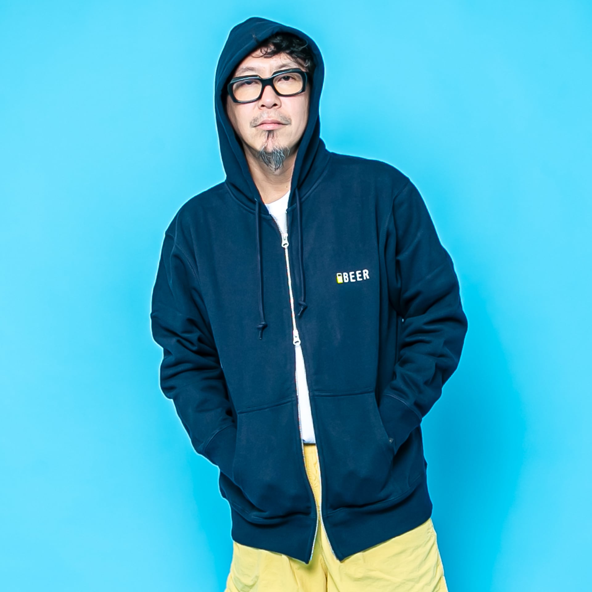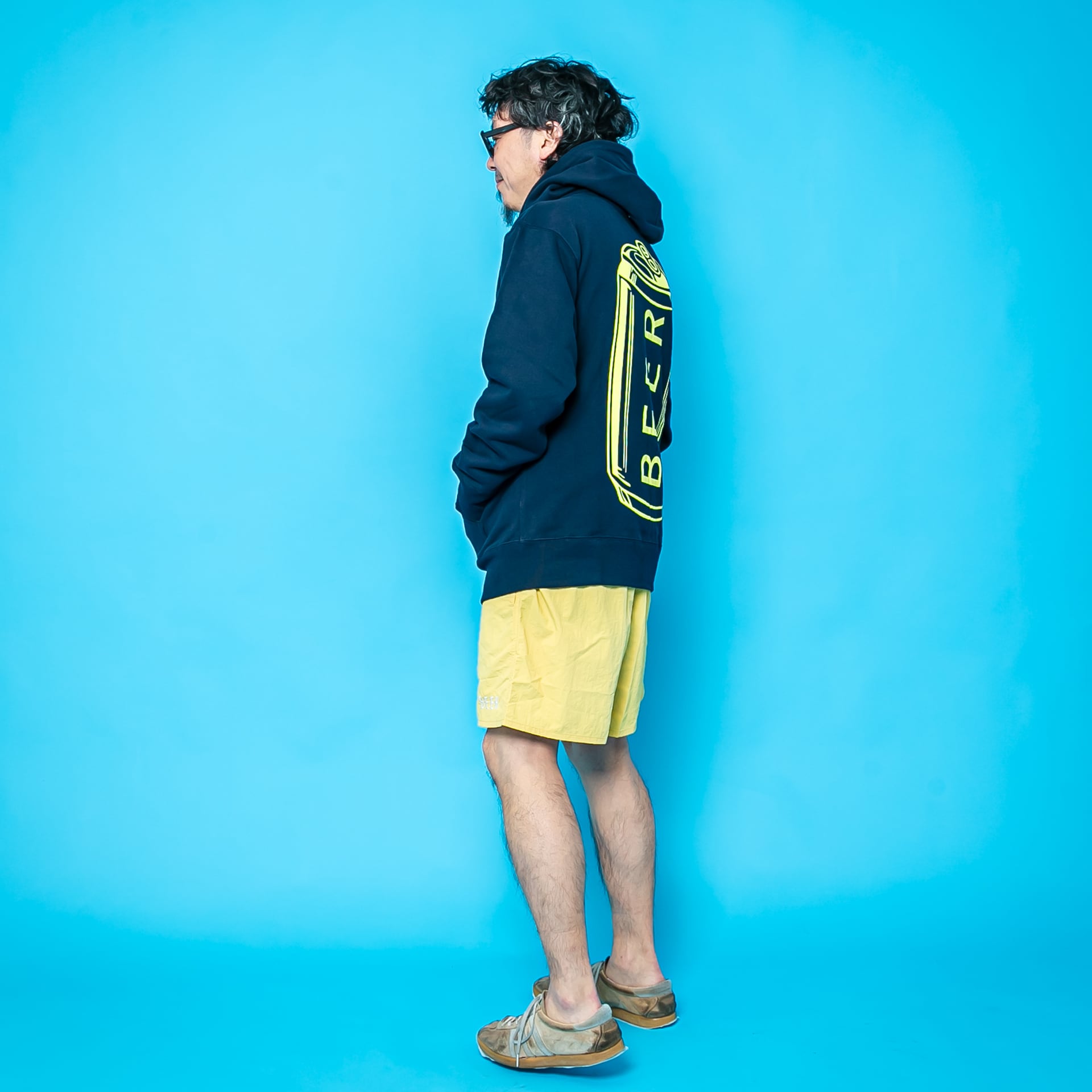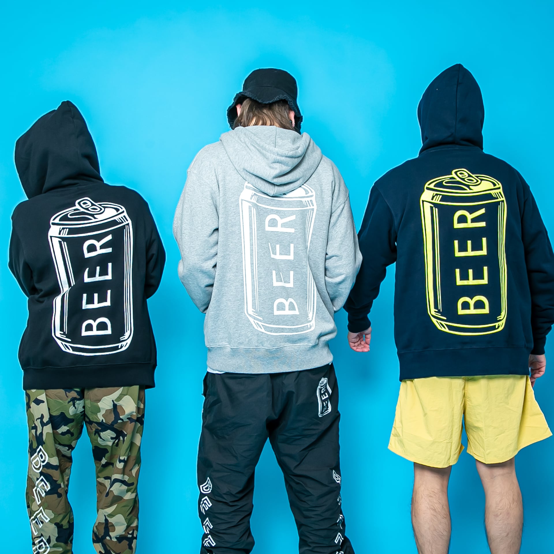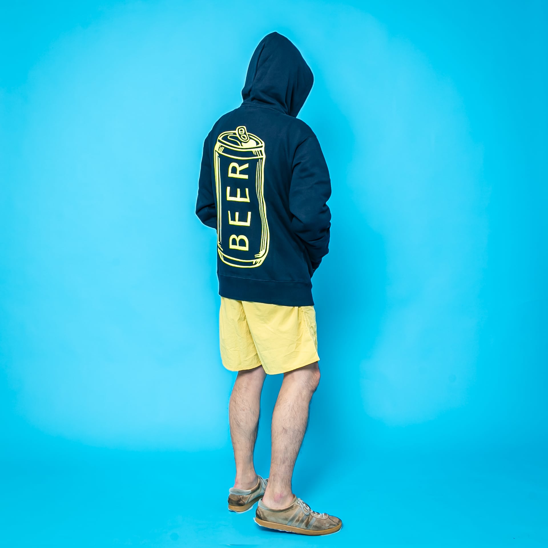 背中に巨大なBEER缶ロゴのシルクプリント。